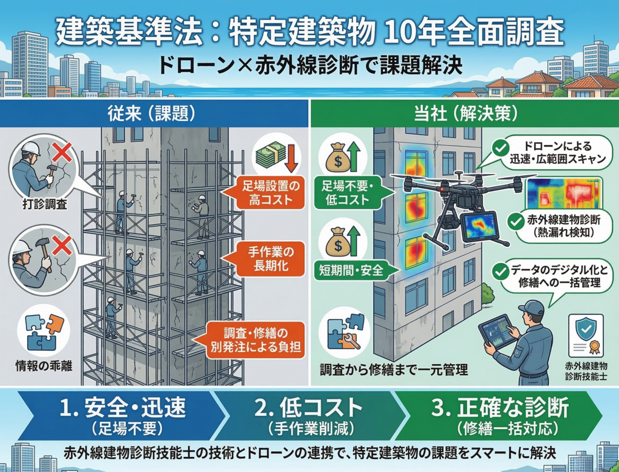 しかし、従来の足場設置による打診調査はコストが高く、また調査と修繕が別発注になることで、元請け会社の負担や情報の乖離が課題となっていました。 当社は「赤外線建物診断技能士」の技術とドローンを組み合わせることで、この構造的課題を解決します。